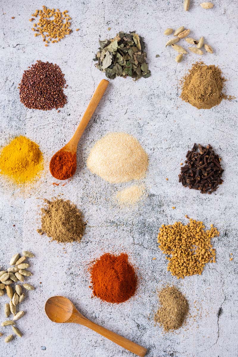 - Combine curry leaves, fenugreek seeds, cardamom seeds, ground cumin, brown mustard seeds, turmeric powder, ground nutmeg, red chili powder, and cloves in a mixing bowl.